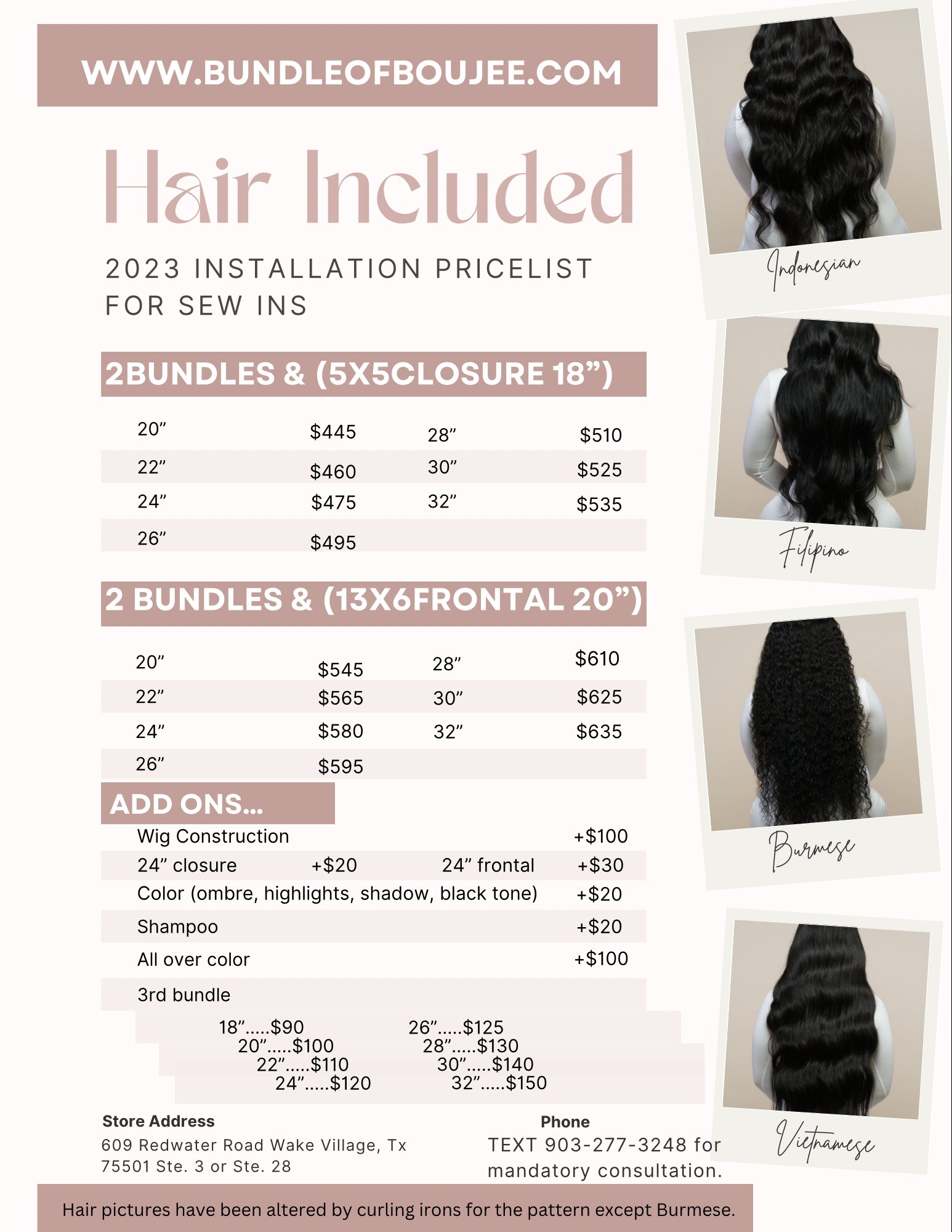 The length and density of your natural hair, as well as the desired length and volume of the sew in, can affect the overall cost. Longer and thicker hair typically require more time and materials, which can result in a higher price.