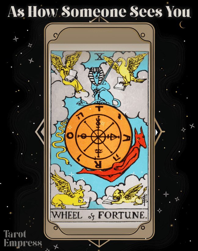 When the wheel of fortune card appears in a tarot reading, it suggests that the person sees you as someone who is going through cycles of change and transformation. They may view you as someone who is adaptable, open to new opportunities, and willing to embrace both the ups and downs of life.